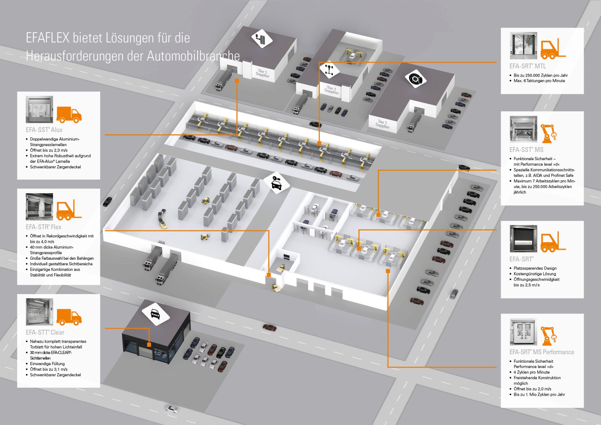 die speziell auf Ihre Wünsche und Bedürfnisse abgestimmt sind. Tor-Lösungen von EFAFLEX für die Automobilindustrie sind auf eine hohe Zyklenzahl pro Jahr ausgerichtet und überzeugen durch eine lange Lebensdauer. Dank höchster Öffnungs- und Schließgeschwindigkeiten sorgen sie für möglichst effiziente Prozess- und Arbeitsabläufe sowie Kosten- und Energieeinsparungen.