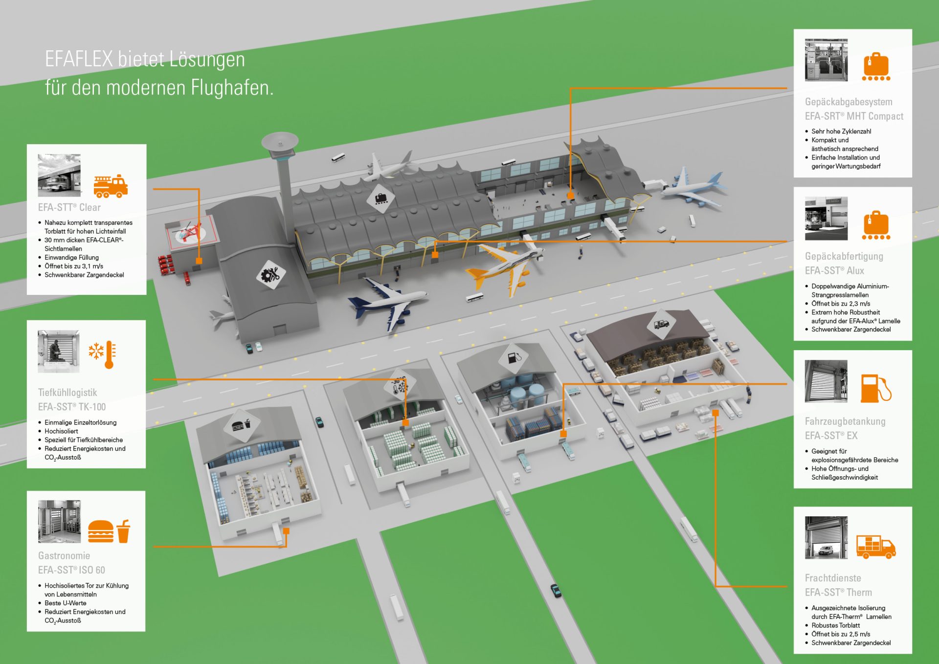 EFAFLEX hat eine Auswahl von Schnelllauftoren entwickelt, die auf die speziellen Bedürfnisse des Flughafensektors zugeschnitten sind. Diese Tore wurden insbesondere für Bereiche wie Gepäckabfertigung, Catering und Betankung konstruiert und tragen dazu bei Energiekosten zu senken, die Personensicherheit zu verbessern und kostspielige Ausfallzeiten zu minimieren. Die Tor-Lösungen für den Flughafensektor sind schnell, effizient, zuverlässig und halten Windlasten von bis zu 220 km/h stand.