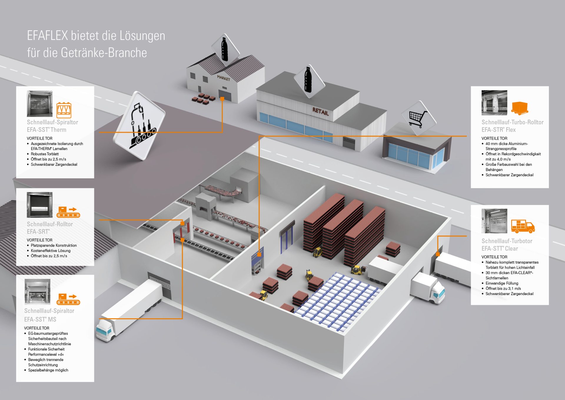 Kurze Offenhaltezeiten gewährleisten die, für die Getränkeindustrie eminent wichtigen, konstanten Temperaturen in Produktions- und Lagerräumen. Spezielle Maschinenschutztore schützen zudem Anlagen und Menschen und lassen sich mit ihrer platzsparenden, kompakten Bauweise nahezu überall optimal integrieren.