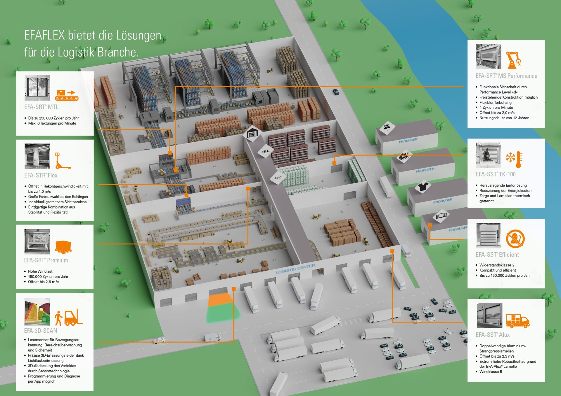 Die Logistik-Branche stellt die Schnittstelle zwischen Wirtschaft, Handel und Endverbraucher dar. Bei der Steuerung der Warenflüsse kommt es dabei vor allem auf Effizienz und einen reibungslosen sowie störungsfreien Ablauf an. Die speziell für den Logistikbereich entwickelten Schnelllauftore von EFAFLEX beschleunigen Ihre logistischen Prozesse,